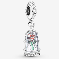 Add a magical touch to your style with the Disney Beauty and the Beast Enchanted Rose Dangle Charm. It features a transparent light blue Murano glass dome with engraved stars encasing a cut-out rose with red and green hand-applied enamel details. Hand-finished in sterling silver, the charm is decorated with clear cubic zirconia stones and micro-beads on the bail and features the engraving "Beautiful as a Rose" on the bottom. A spellbinding reminder of the power of love.