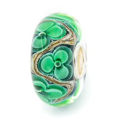 This glass bead has flowers with three petals that have a base color of Jungle Green with hints of bright Granny Smith Apple for shading. The flowers have a very subtle outline of Gunmetal Grey and all have a delicate bubble at its center. The flowers float on a shimmery base of Teal Blue that has incredible flash as it catches the light. There is an undulating river of variegated Taupes outlined in Crisp White weaving itself around each flower for added depth and interest on the bead.