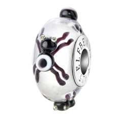In the depths of the Halloween night, the Nightmare Watcher Starlight bead casts an eerie glow, revealing the chilling presence of its black spiders. Each one carries the eye of a lurking creature from another realm, watching your every move. These glowing watchers serve as reminders of the nightmares that might creep in when the shadows grow long. With their poisonous gaze, they embody the thrill and danger of the unknown, inviting you to confront your fears as you explore the mysteries of the night. Our glass beads are crafted from the highest quality glass, sourced from all over the world. Each bead has a silver core with a 4.7mm hole, compatible with Elfbeads, Pandora, and Trollbeads bracelets. The core is marked with the E925 hallmark, representing Elfbeads and sterling silver 925.