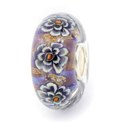 This glass bead has a double ruffle flower that has a medium BlackBerry Purple along with lighter white tips to give this flower incredible depth and beauty! There is a pop of Rusty Orange at each flower center for added interest. The flowers themselves float on a shimmery base of Lilac to deeper shades of Blue Violet.