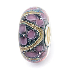 This glass bead has flowers with three petals that go from light to a darker dusty Violet. Each flower has a very subtle bubble center. The flowers float on a shimmery base of Teal Blue with flashes of a brighter Robin Egg Blue as it catches the light. There is an undulating river of variegated Taupes outlined in Crisp White weaving itself around each flower for added depth and interest on the bead.