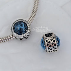 Wear the beauty of clear blue skies with this blue-toned charm. The sterling silver charm features rose-cut crystals and clear cubic zirconia that add a dramatic dose of sparkle to your wrist. Cut-out hearts wrap around every side, giving a romantic edge to the button-shaped charm. Style it on your favourite charm holder and add a pop of colour to your everyday look.