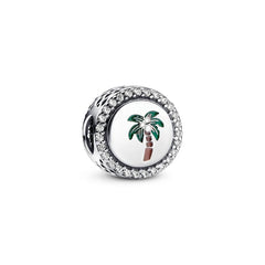 Show off your travel skills with the Engravable Palm Tree Charm, a sterling silver piece with 54 clear cubic zirconia stones. Its unique design features a vibrant palm tree motif enameled in grass green and cocoa brown on one side, while the other side is polished for extra shine. Special features include cutout diamond shapes around the charm and pavé-set edges on both sides of the hoop. Personalize it by engraving it with a special message. Inspired by palm trees, this charm is a perfect souvenir from your travels in Spain.