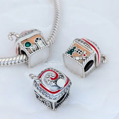 Celebrate what makes the holidays sweet with this Festive Gingerbread House Charm. This cute sterling silver house-shaped charm is decorated with realistic caramel brown, red and green enamel and features delicious details including candies and lollipops on the walls, a door with a tiny heart-shaped handle and a swirled icing roof complete with a chimney and rows of sparkling pavé. A Christmas tree detail on one wall adds the final festive touch. Wear a reminder of cozy holiday traditions on your jewellery and celebrate the happy memories of the season.