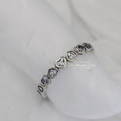 Make a sparkling, stackable declaration of love! This delicate hand-finished ring by PANDORA not only features a band of sweet sterling silver hearts, but also beautiful heart-shaped stones.