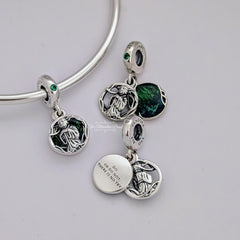 Be a true fan with the Star Wars™ Yoda™ Dangle Charm. Hand-finished in sterling silver, this charm includes two dangles, one an openwork design featuring Yoda™ standing with his gimer stick framed by raised ivy, the other a disc featuring hand-applied green and blue enamel with forest details. The backside of the second disc is engraved with "Do. Or do not. There is no try" and the bail is engraved with "Jedi master".