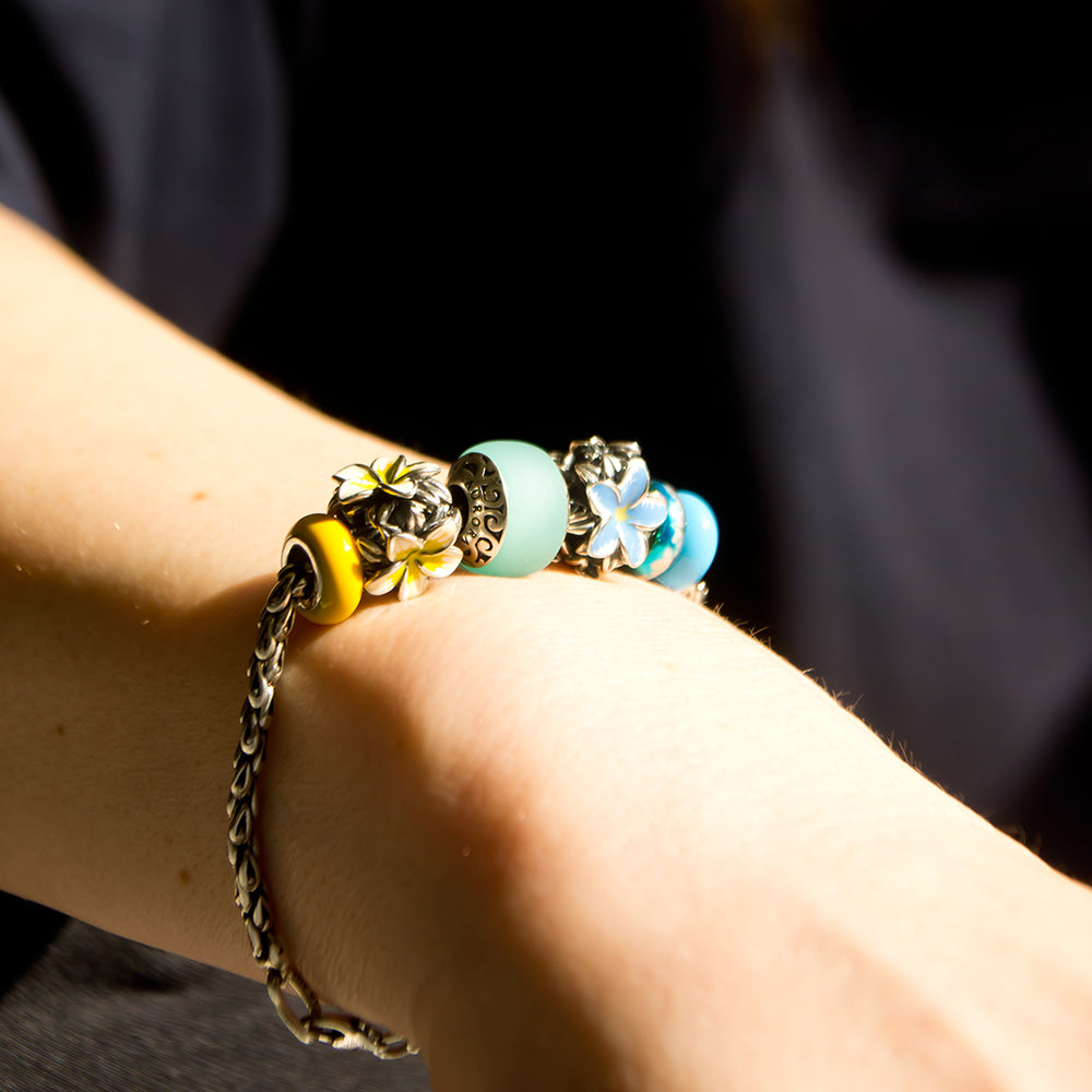Bora Bora Island Blue Sea Glass Bead Sterling Silver Aurora Charm from our exclusive Glass & Silver Collection. This bead is combination of sterling silver motif with maori style ocean waves and the blue sea glass look. An absolute must have for every summer, beach and holiday bracelet! We captured the colour of summer in this bead. When you look a it, you feel and remember the warm ocean water on your skin, relaxing on the cabanas dock, while watching the millions of fish swimming around you. In the same vein, if you know someone may be one of your friend, who was in Bora Bora before, surprise her with this bead.