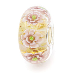 This glass bead has a double ruffle flower that goes from a delicate pale Chiffon Pink to a slightly darker Powder Pink to give the flowers depth. There is a pop of Celadon Green at each flower center for added interest. The flowers themselves float on a shimmery base of a Pale Sunshine Yellow with flashes of Sky Blue.