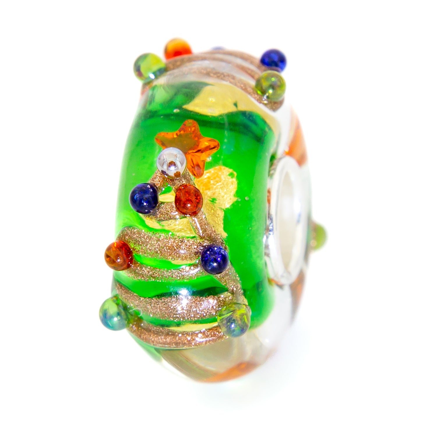 This gorgeous bead has three stylish golden Christmas trees decorated with ornaments and an orange diamond-shaped star engraved into the body of the bead. The sparkly green base with golden brushstrokes gives it an extra chic feel. All our glass beads are made with the highest quality glass, sourced from all over the world. All our beads have a silver core with a 5 mm hole that fits all European bead brands. Our cores are marked with E925. This logo stands for Elfbeads and sterling silver 925. If you want to be sure if your bead is an original Elfbeads, you can check the logo in the core.Teilen