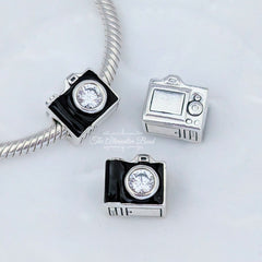 Capture the moment with PANDORA's camera charm. Hand-finished from sterling silver and decorated with shiny black enamel and a single cubic zirconia stone, this charm is symbolic of the places you have seen and cherish for years to come.