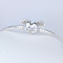Present your loved one with the Pandora Moments Winged Heart Bangle. Hand-finished in sterling silver, this design features a heart-shaped clasp. The engraving on the front reads “Always by your side” with a small indented heart beneath it. Two moving angel wings feature on the back of the clasp. Gift this piece to your family member alongside a pair of heart-shaped sterling silver earrings to make them feel extra special.