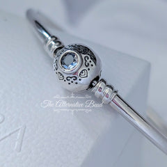 Wear or share this sterling silver bangle as a reminder of your curiosity for life. Engraved with the words "Never Lose Your Sense of Wonder," the sleek design holds a stone-studded ball clasp detailed with exotic flourishes and the Pandora and Disney logos.